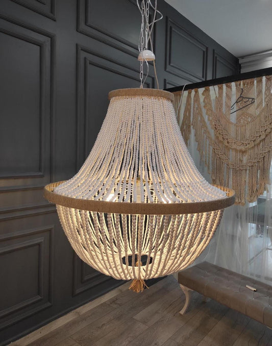 Large White Beaded Chandelier: Boho Pendant Light, 80 cm