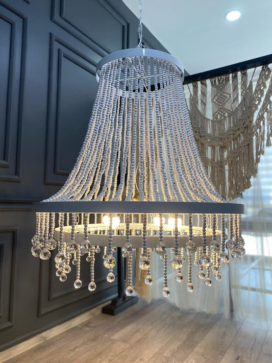 Large Crystal Beaded Chandelier – White Wood Pendant Light, Luxury Ceiling Lamp, Dining Room Light