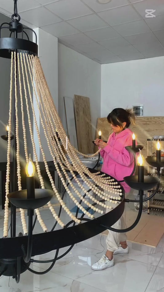 Large Wooden Bead Chandelier: Boho Farmhouse Lighting