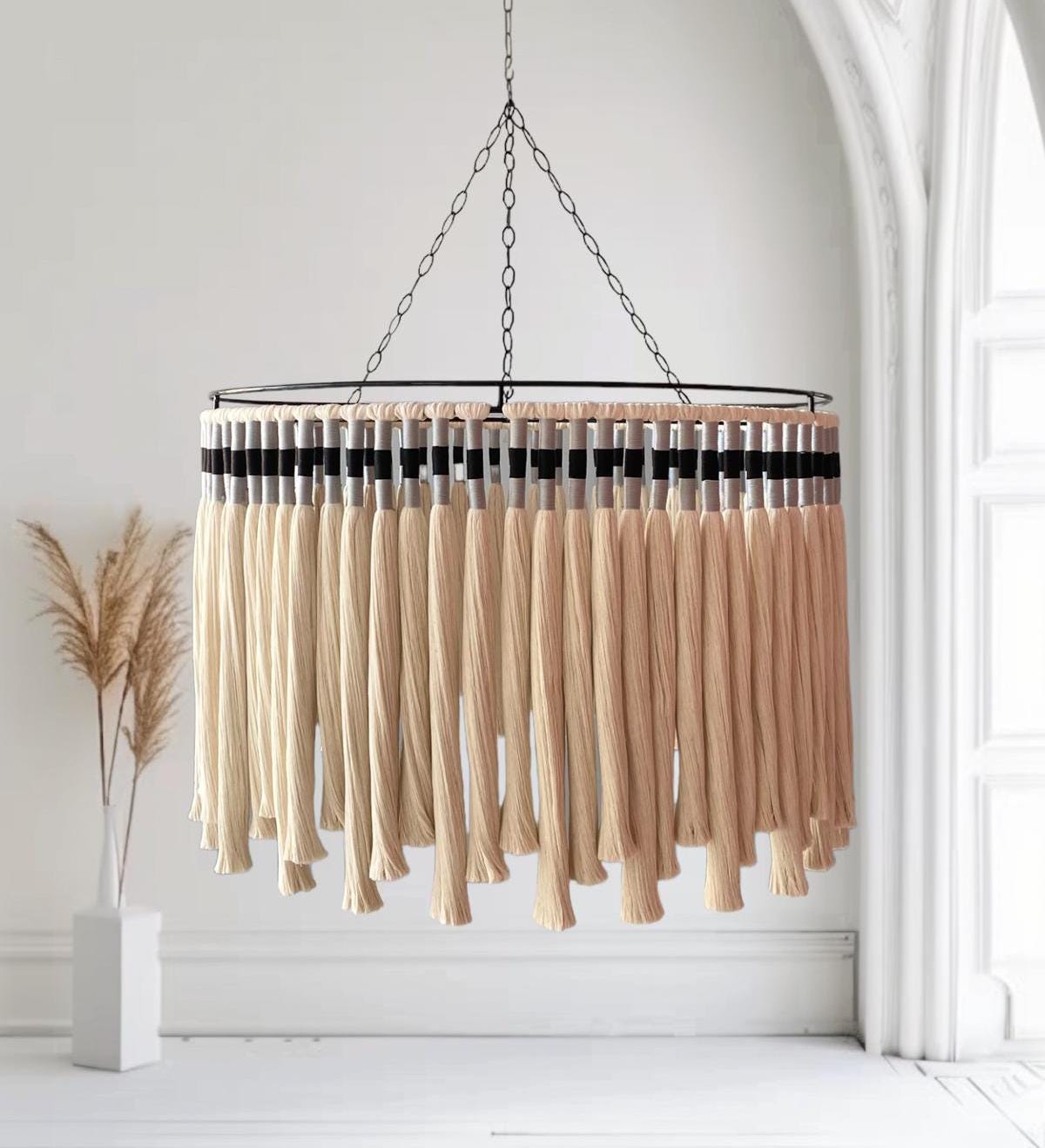 Cotton Tassel Pendant Light, Bohemian Light, Modern Macrame Light, Organic Home Decor, Custom Macrame Chandelier, Woven Chandelier,